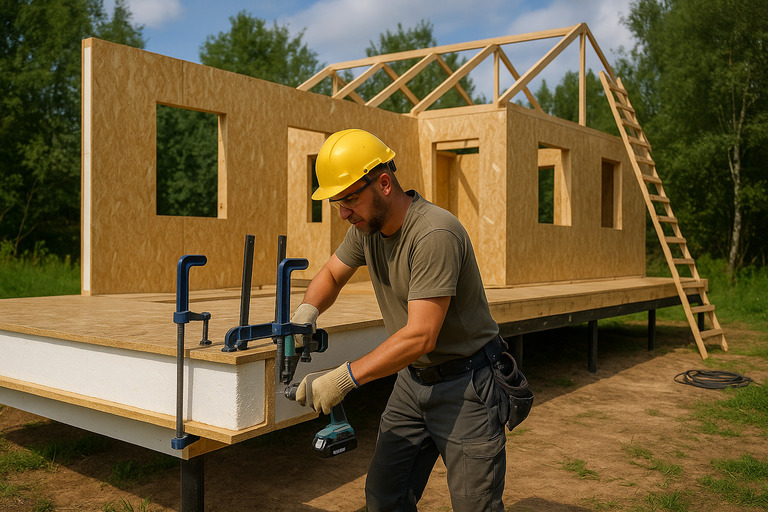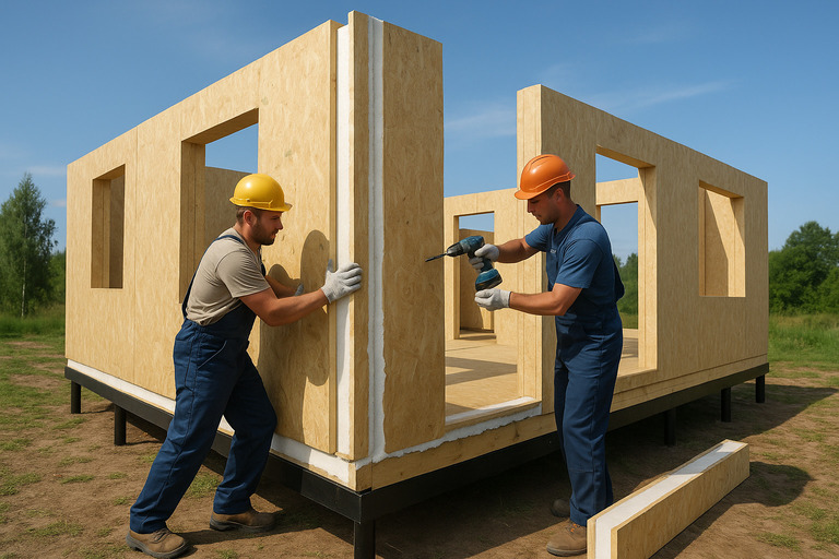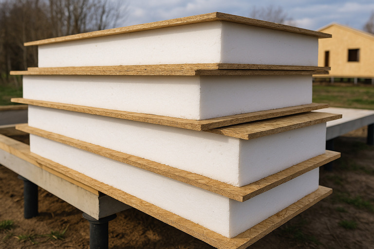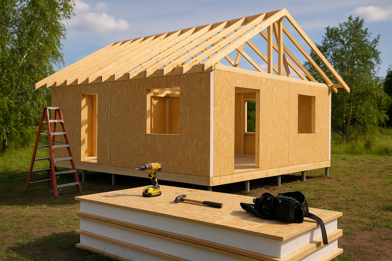 СИП-панель — это два листа OSB, между ними утеплитель (чаще EPS). Дома из таких панелей возводятся довольно быстро. СИП-панели легкие, поэтому не требуют массивного основания. Ровная геометрия заводского раскроя помогает получить прямые углы и аккуратные стены, что сокращает время на отделку.